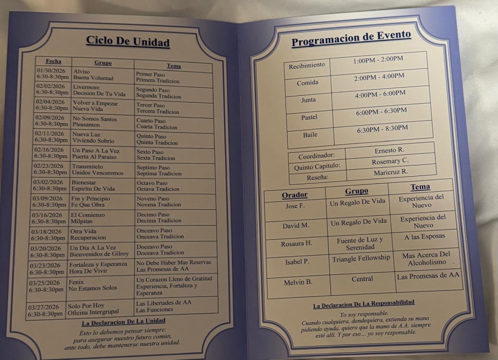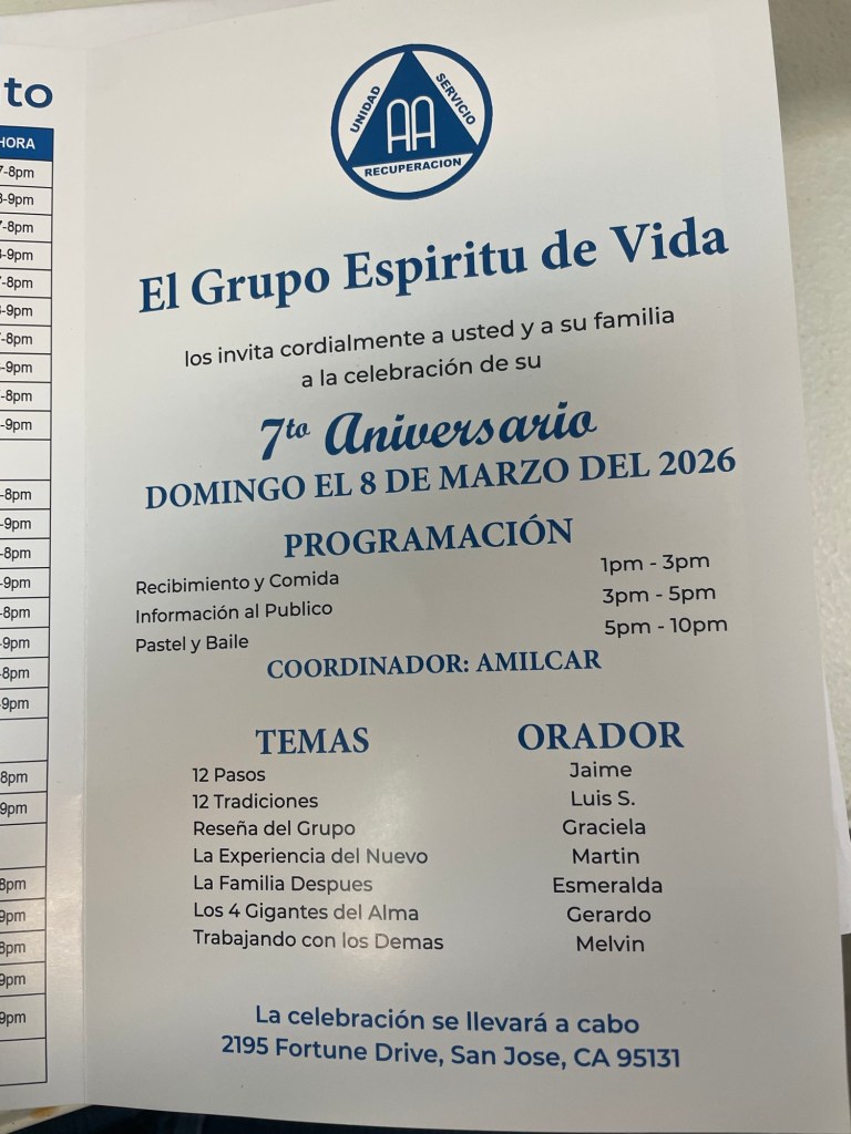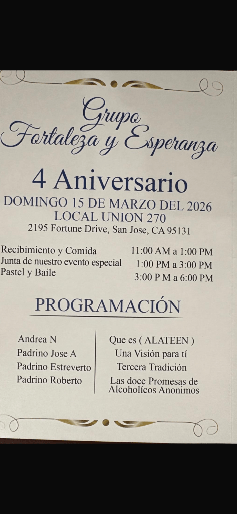 Compañeros y conpañeras el grupo milpitas los está invitando a ser parte y compartir con ellos la fortaleza y esperanza en unidad en su nuevo horario de sección todos los días de 10:00 de la mañana a 12:00 pm si alguien anda cerca de el grupo y tenga necesidad no dude en vicitarlos los esperamos de hoy en adelante el grupo tendrá 2 horarios el ya mencionado y de 7:30 a 9:30 pm no falten !!!